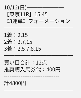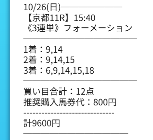 秋競馬一発目のG1的中が3連単14万馬券。 この買い目的に3着に入ったエキサイトバイオ2番手評価って事だよな。 1402.7倍決着だったけど仮にエキサイトバイオが2着だったら3連単2585.8倍で一撃2,068,640円だった。 残念ながら3着だったけどそれでも帯封突破の1,122,160円的中。 2025年も佳境に入り末恐ろしい予想サイト発見しちゃいました。