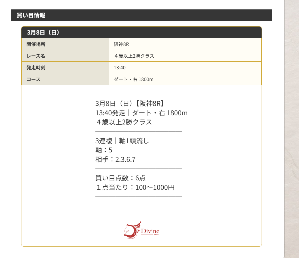 2月末にオススメされてから利用開始しました、まじまじ見るようになったのは3月1日の無料予想からです。 まずは初週となる1日目も当たり、そして2週目の8日に無料予想を利用。 阪神8Rドンピシャでしたねしかも買い目6点とか点数絞って最高です! 今週の結果は6万5600円の的中でした、3週目もリピート確定ですね。