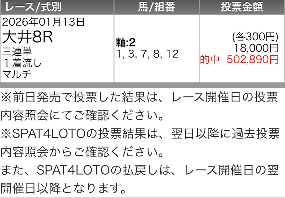 他のサイトで結構やられてるので期待はしてなかったけど110960円の的中もらえたのはすごく嬉しい。他の予想にも期待できそう。