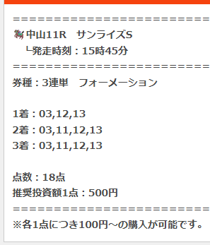 おそらく初回しか適応されない『スタートダッシュプラン』想定配当30~50万円、通常価格→7万円が9,800円。 安いし負けてもいいや感覚でやったらスタートダッシュどころか上半期分の収支をたった1レースで稼がせてもらいました。 フェアリーステークス15-4-1的中で、結果は公式乗ってるので引用はしませんが払い戻しは1点200円で賭けていたので175万8160円払い戻し、想定配当×3倍以上!